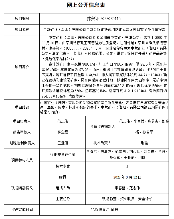 中营矿业(洛阳)有限公司中营金铅矿铁锁沟尾矿库建设项目安全预评价