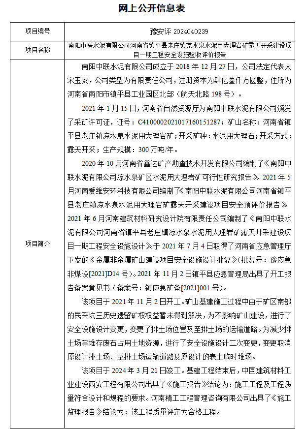 南阳中联水泥有限公司河南省镇平县老庄镇凉水泉水泥用大理岩矿露天开采建设项目一期工程安全设施验收评价