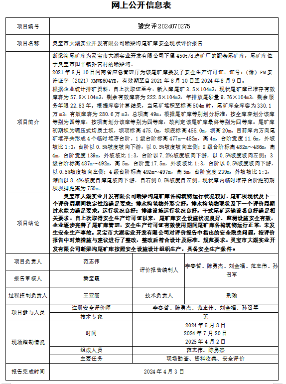 灵宝市大湖实业开发有限公司断梁沟尾矿库安全现状评价